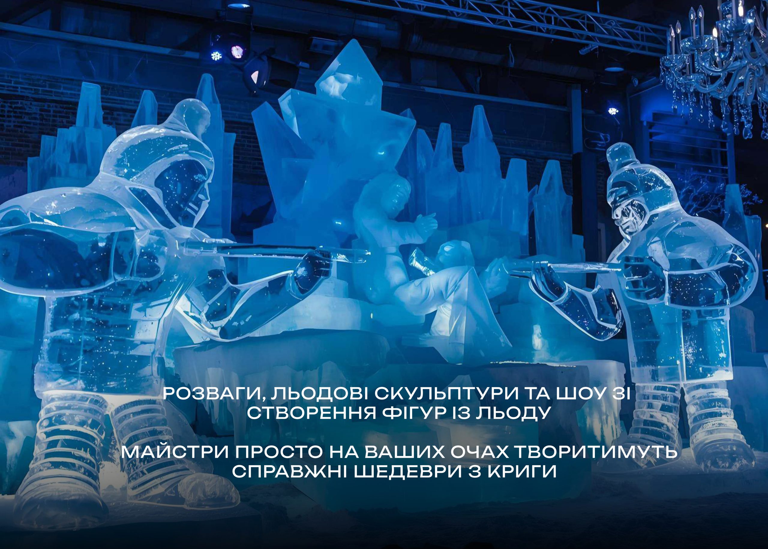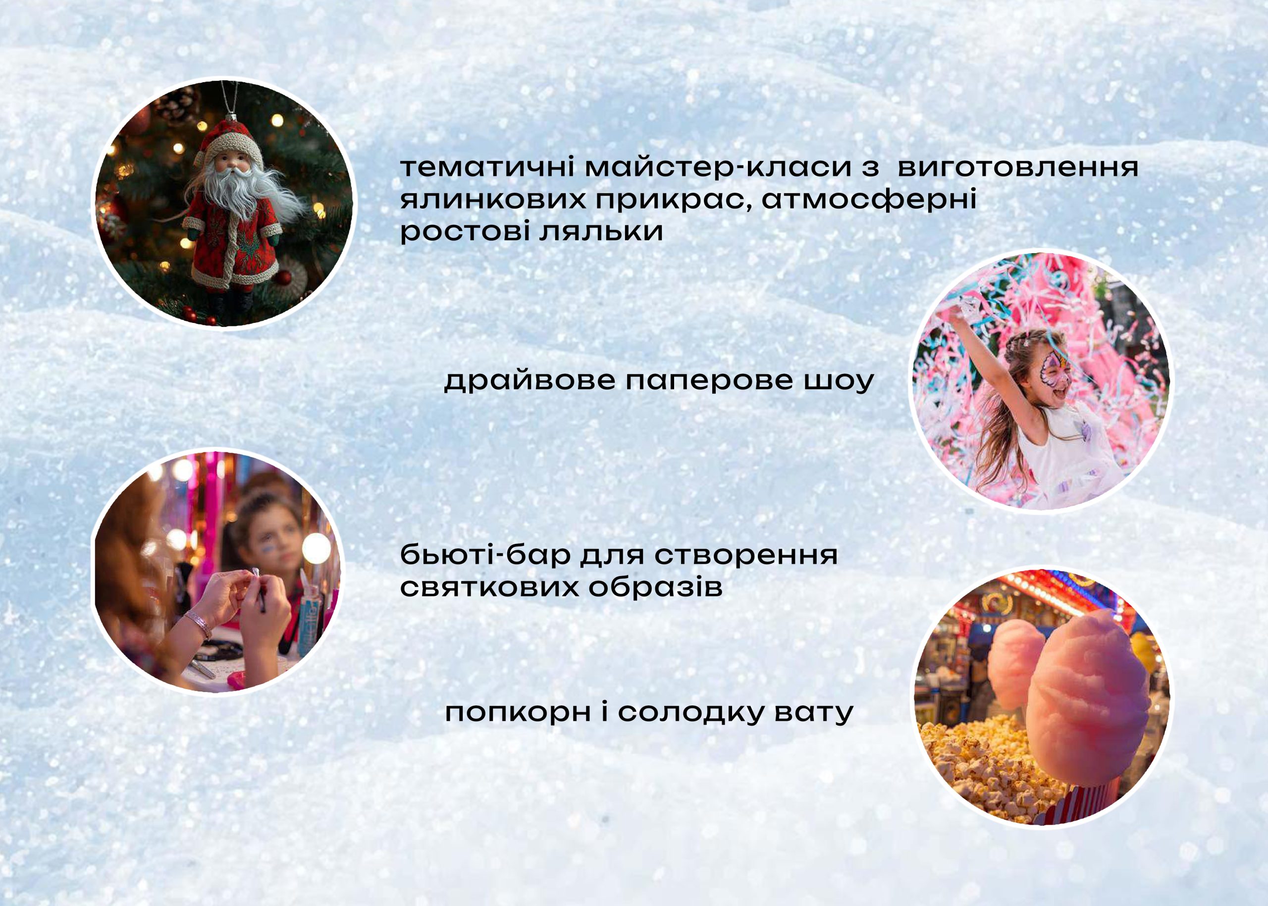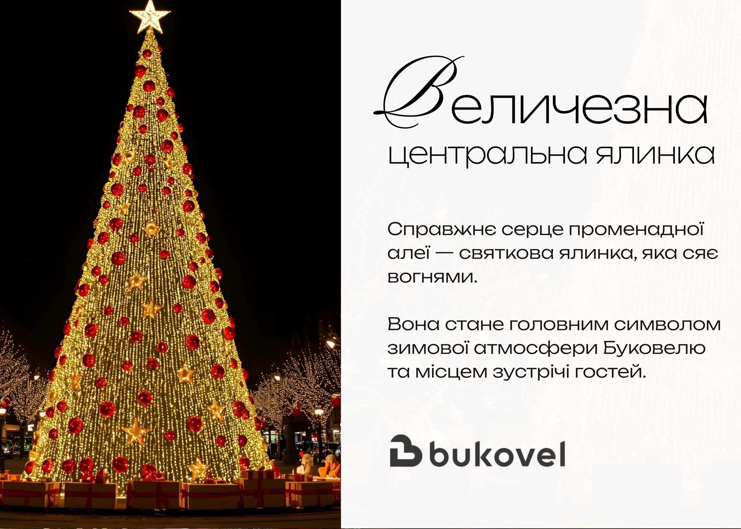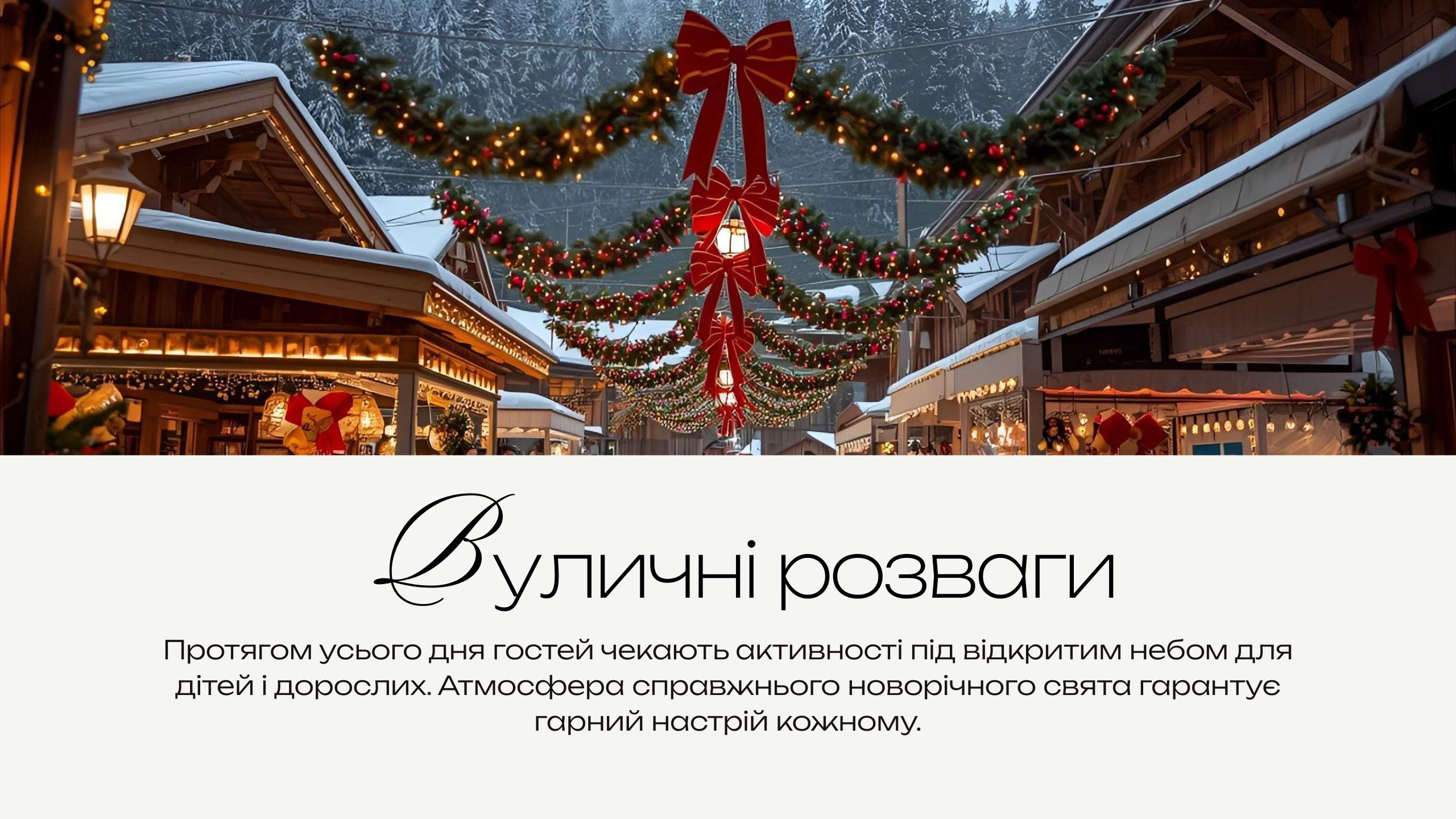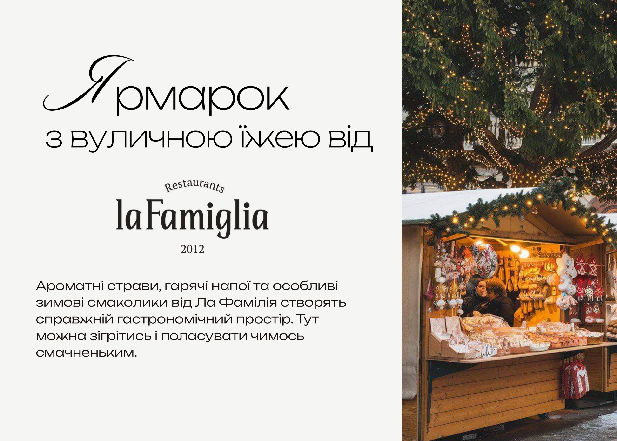 Для вас: вуличні розваги, фестиваль їжі від La Famiglia, дитяча анімація, шоу льодових скульптур, святкові фотозони, величезна ялинка та розіграш подарунків!