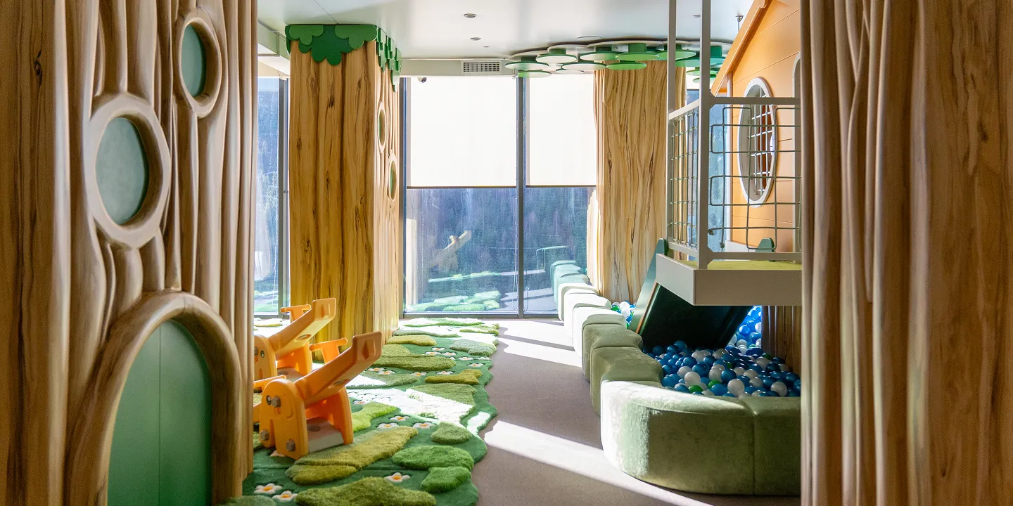 Glacier Kindergarten розташований безпосередньо в готелі і приймає дітей від 6 місяців до 5 років. З вікон садка відкриваються панорами на озеро Молодості, майбутній біатлонний стадіон і ландшафтний парк — кожен день тут наповнений цікавими заняттями та щасливими емоціями.